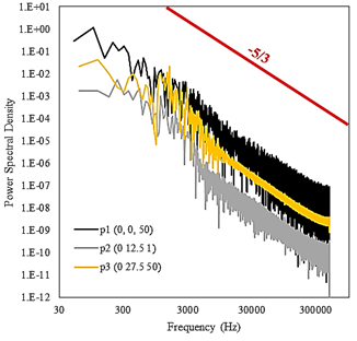 Turbulent flow is a transient phenomenon, but at some time a statistically stationary state is reached. Such state is not reached until the turbulence is fully developed. In order to find out when the flow is fully turbulent, a spectral analysis is required. According to Lacaze et al. when the turbulent flow is fully development the Power Spectral Density (PSD) show a decay rate of about -5/3 36. For the PSD analysis three points were sampled, when simulation reached 50000 time-steps a Fast Fourier Transform was computed from the axial velocity time series measured. Fig. 8 shows the location of the sampled points and the PSD of the axial velocity at those points.