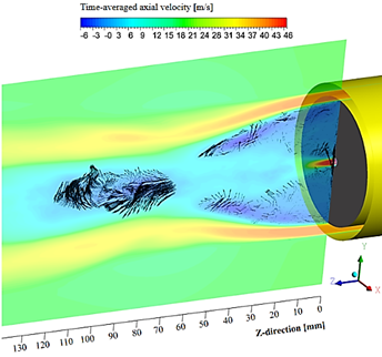 Safavi and Amani 11 have conducted an assessment of RANS, LES, and hybrid turbulence models for non-premixed swirl-stabilized flames, where RANS models do not entirely capture the unsteady boundary layer separation close to the bluff body zone. As result, an underestimation of the primary recirculation zones, a slower mixing rate on the bottom of the flame, and some unphysical behaviours of the flame were found. De Santis et al. have conducted an investigation where several LES sub-grid models were tested for diffusion swirling flames. It seems that jet penetration into the highly rotational flow field, formed by the swirl air supply, is still very hard to accurately quantify by the LES sub-grid models assessed 12. Despite the remaining challenges, both authors highlight the great importance of the instantaneous velocity field resolution accomplished by the LES model.