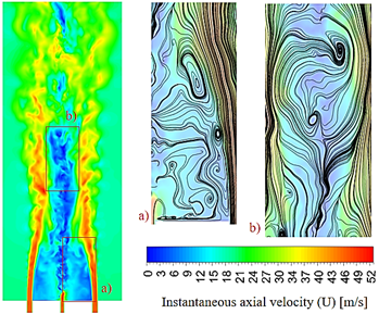 Vectors plot shows the highly rotational flow motion of fluid parcels at the BRZ and VBB zones. Fig. 11 shows the contours of instantaneous axial-velocity with a zoomed in of streamlines for the BRZ and VBB zone. It can be realized by the formation of a high-velocity shear-layer surrounding the combustor center-line and the two main recirculation zones. The flow separation behind the bluff the body and the vortex breakdown at downstream of combustion center-line stretch the high velocity shear layer forming the neck. The insufficient resolution of the instantaneous velocity field in the shear layer region, seen on Fig. 6 could contributes to the difficulty of the LES model to properly locate the neck. Fig. 13 shows the profiles of time-averaged axial velocity for the LES simulation, mean axial velocity profiles for experimental measurements and precursor simulation. It turns out that LES and RANS simulation fairly capture the main velocity-profile shape.