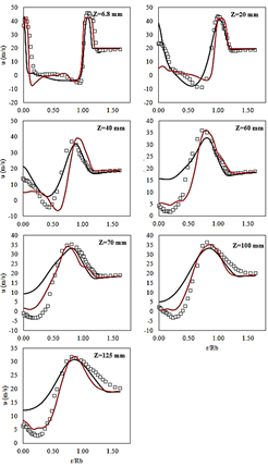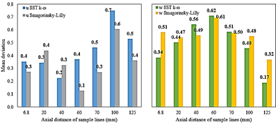Fig. 12 shows the mean deviation of time-averaged axial and tangential velocity for LES simulation, as well as mean deviation of mean axial and tangential velocity for the RANS simulation. Five radial profiles showed a lower mean deviation of axial velocity for the LES than axial velocity for the RANS simulation. At z = 20 mm and z = 40 mm the mean deviation of axial velocity was lower for the RANS simulation than axial velocity for the LES simulation. In the case of the tangential velocity, LES shown a lower deviation than RANS simulation in only two radial samples, at z = 40 mm and z = 60 mm. At the other radial samples, the RANS simulation outperforms the LES simulation.
