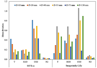 Fig. 15 shows a wide difference between the experimental data and RANS results for the radial samples of temperature and CO 2 mass fraction, taken at z = 10 mm and z = 20 mm. The experimental data suggests no presence of such temperature peak behind the bluff body. Meanwhile, results from the LES simulation fairly agree with experimental data in this matter.