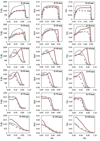 Figure 15: Profiles of time-averaged temperature, mean temperature, mean H2O mass fraction and mean CO2 mass fraction for experimental data (squares), RANS (grey line) and LES simulations (red line)