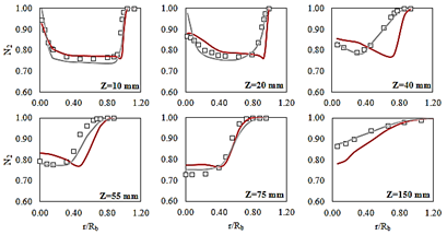 Figure 16: Profiles of mean N2 mass fraction for experimental data (squares), RANS (grey line) and LES simulations (red line).
