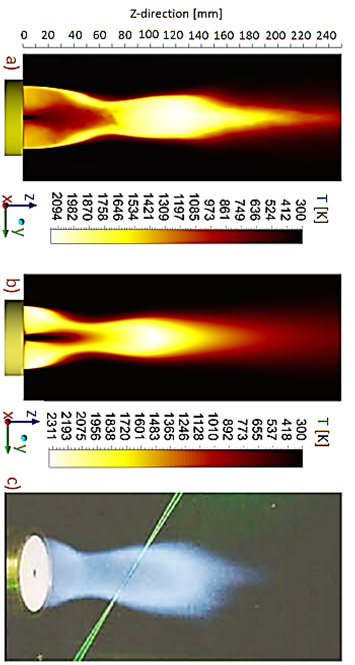 Figure 17: Temperature contours: a) time-averaged temperature, b) mean temperature (RANS model) and c) a photograph of SMA1-flame.