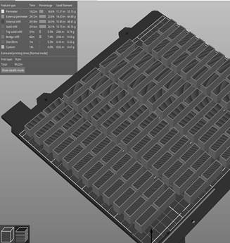 In Fig 1, we can see one of the plates with specimens with a 100% filling. Its design was made in the Fusion 360 software, then exported in PrusaSlicer and subsequently to its manufacture. The layer height for the printing of all the specimens was 0.2 mm, because this configuration provides the best finish/efficiency relationship at the moment of producing the prototypes.