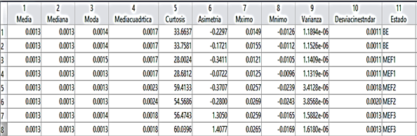 Fig. 2 shows the result obtained in the data processing, this table format is necessary for the training of the classification algorithm since it contains the 10 characteristics as independent variables and the 4 labels as dependent variables, useful within autonomous learning. supervised. In the example, only 2 data samples of each state are found, the number of samples increases in the final training.