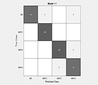Training on the 3 flaws created registers an efficiency of 97.5%, that is, the algorithm has difficulty classifying 1 out of 40 tests. To verify this percentage, each training session is evaluated using 40 tests (20 in BE and 20 in ME) data samples that were not used initially.