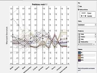 The parallel coordinate matrix of Fig. 6 indicates the path of each data sample through its characteristics, it is noticeable how each category follows the same path and varies markedly from the others. The continuous lines are those that have been correctly classified while the broken lines belong to the samples that created confusion within the algorithm.