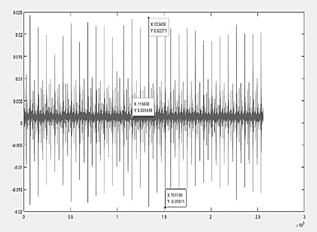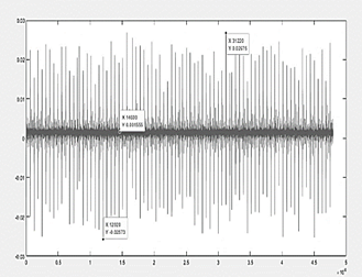 In Fig. 7, the vibrations belonging to the good condition data show symmetry and homogeneity along their trajectory, containing a maximum value of 0.021 V at their peak and a minimum value of -0.017 V at their lower peak, if It is taken into account that the origin of its amplitude begins at the point 0.0013 V as the midpoint of the vibration, the graph is distributed equally in both directions. In most of the graphs belonging to the category of good condition it is given this form.