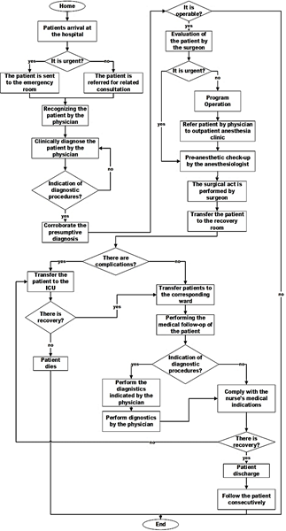 Process management and improvement is one of the best practices currently recognized in the field of business management [4]. There are many experiences in the improvement of hospital processes. The process approach to hospital management is increasingly applied, a philosophy that shows a holistic approach and pursues hospital excellence with a strategic vision [5], the process representation as a synthesized way to see relationship between activities [6], analysis of patient waiting times [7], level of service provided [8], the planning process [9], such as the uses of case mix measurement systems [10,11] and, within them, the Major Diagnostic Categories (MDC) as a more universal, mutually exclusive patient grouping system, according to affected organs or systems, based on the main diagnosis of the episode [12], the MDC can be disaggregated in more specific ways into the Diagnosis Related Groups (DRGs) as a system for grouping patients into clinically coherent classes with equal resource consumption [13-15], are of vital importance for increasing hospital efficiency [16].