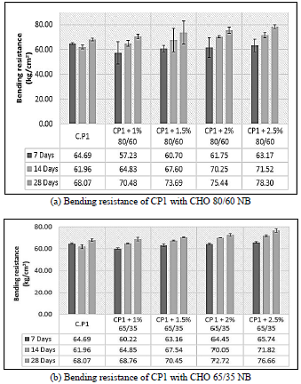 There is an increase of 23.05% and 17.63% in bending resistance with respect to the standard concrete of 380 kg/cm2, with 80/60 and 65/35 fiber additions, respectively, as well as an increase of 21.73% and 18.25% in bending resistance with respect to the standard concrete of 480 kg/cm2, with 80/60 and 65/35 fiber additions, for all cases with 1.5% of fibers.
