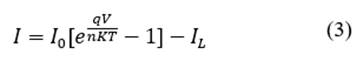 Analysis of the V-I curve of the solar cell under lighting conditions shifts the curve slightly towards the fourth quadrant where energy can be extracted, such that the current can be analyzed with eq. (3):