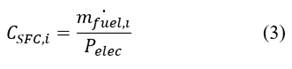 Specific fuel consumption (SFC), expressed in g/kW-h (see Eq. 3), takes into account the total mass flow rate of all fuels used during the tests (