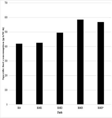 ) is used to assess consumption when different fuels are utilized. The data provided by the precision scale during the tests (Table 4) show a decrease in fuel consumption with 1% ethanol (1,407 g/h) when compared to S-10 (1,485 g/h), followed by an increase in consumption for the other blends. This increase occurs because the fuel injection system tends to add a larger amount of fuel to accomplish the same displacement, considering that energy is lost when ethanol is added. Fuel consumption increased as ethanol was added to S-10 diesel, accounting for 1,504 g/h (B10E2) and 1,541 g/h (B10E3).