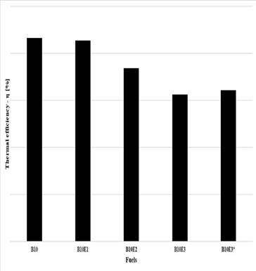 ) and the NCV, can describe the phenomena that occur in the engine in terms of energy performance [9]. The values observed in Figure 3 for the fuels used show a decrease in thermal efficiency as the percentage of ethanol in S10 increases, yielding 21.35% for B10E1, 18.42% for B10E2, and 15.65% for B10E3. These values corroborate those found for SFC, which increases with the ratio of ethanol. Regarding injection pressure, an increase in efficiency was observed for B10E3* at 22 bar when compared to B10E3, at 18 bar.