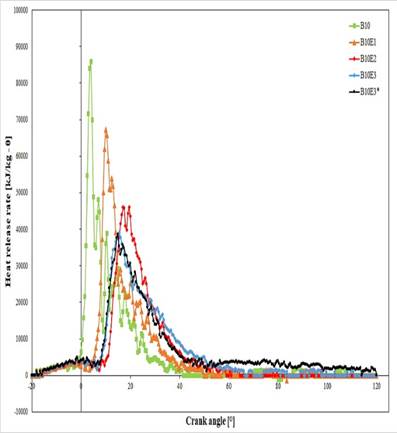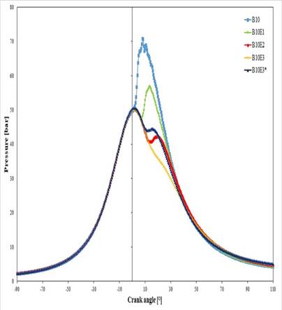 When the B10E3 and B10E3* blends are compared with different injection pressures, both blends reach a similar maximum pressure at the end of premixed combustion, indicating similar fuel consumption, but diffusion combustion is faster at a higher pressure, and that is expected because a higher injection pressure causes smaller drops of fuel, which evaporate faster. Kim et al. [10] found different values from those shown in Fig 5, higher heat release rates with the increase in the percentage of ethanol.
