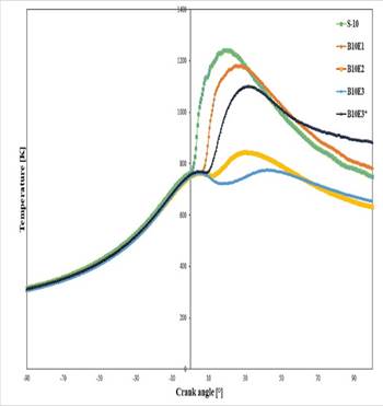High temperatures are observed when only S-10 diesel is used, with a maximum peak temperature of 1241 K, which decreases as ethanol is added to the diesel, B10E (1180.5 K), B10E2 (843.84 K) and B10E3 (773.38K). The high cetane number contributes to short IDT, leading to a low premixed combustion temperature and increasing the maximum cylinder pressure due to rapid combustion, resulting in higher temperatures, as observed for S-10, which can eventually increase Nox emissions [23]. The results show an ignition delay, followed by a decrease in the temperature inside the cylinder and a decrease in the combustion duration because of the reduction in temperature at the EOC caused by the higher latent heat of evaporation of ethanol, thus reducing the temperature of the blends. When an injection pressure of 22 bar was applied to the B10E3* blend, when compared to B10E3, an increase in the temperature of the exhaust gases and a slight reduction in the ignition delay were verified, triggered by the elevation of the temperature inside the chamber caused by the evaporation of ethanol. Furthermore, the increase in injection pressure generates faster combustion rates, increasing the temperature of the cylinder gas (Fig. 6). A reduction in the temperature in the combustion chamber was observed by Gnanamoorthi and Devaradjane [24], as a result of the evaporative cooling effects of ethanol, which leads to a decrease in temperature.
