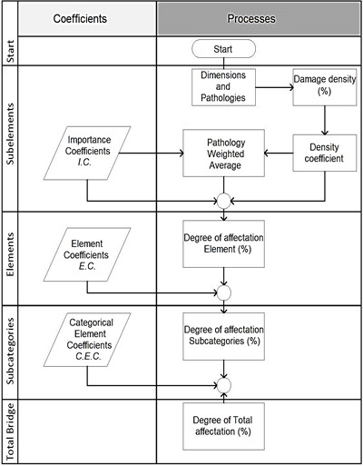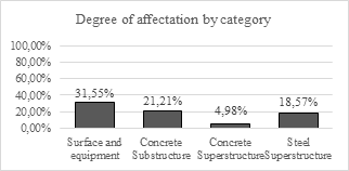 In the fourth stage, the degree of total affectation of the bridge is determined as a result of quantification of the contribution of each deterioration determined in the previous stages for each Sub-category affected by the Categorical Element Coefficients (C.E.C.).