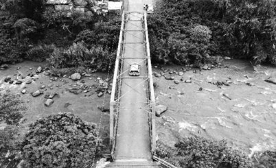 The structural configuration of the bridge consists of warren-type steel trusses. The lower chord is made of W-type beams; the uprights and diagonals of each truss and the lateral bracing are made of simple and double-angle-type steel profiles. Additionally, the upper chord of the bridge is made of elements joined by steel rivets that form a box-type section. All connections are made with plates using steel rivets. Moreover, the bridge deck is a hydraulic concrete slab supported by a framework of W-type steel beams.