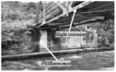 Some of the deterioration detected in terms of the steel structure elements is the deterioration of paint. It becomes a slight corrosion phenomenon in specific areas of the upper chord. On the other hand, in the elements of the concrete substructure, there is evidence of biological contamination of the concrete and efflorescence in a large part of the abutments.