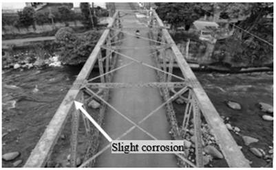 The concrete superstructure has a 4.98% impact on the slab due to some contaminated areas efflorescence on the sides. This agent is due to the high humidity in the area and lack of maintenance on the bridge. The steel superstructure has 18.57% damage, and the lower chords and the diagonals have slight corrosion, as shown in Fig. 6.