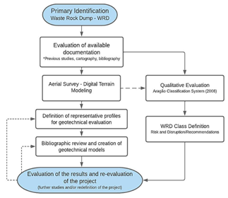The initial phase consists of the preliminary identification of the WRD and the site to be evaluated, then evaluating existing and available documents, such as maps, plans, construction information, and characterizations of the materials of the pile and/or the deposit that is exploited. After that, the qualitative evaluation is started according to the classification system presented by Aragão (2008) based on technical information and geometric evaluations of the WRD. In parallel, mapping with UAV and image processing by digital photogrammetry allows both, to generate a DTM for the assessment of representative profiles for geotechnical evaluation, and information on geometric features and details for the qualitative evaluation. The final steps consist of evaluating the geotechnical models. Initially, it is recommended to evaluate the simpler models by equilibrium limits and parameter inference. However, in the final evaluation, if the results evaluated in conjunction with the qualitative evaluation are not satisfactory, the previous steps of the qualitative analysis should be reconsidered. Additional material characterization studies and stability evaluations can be performed using more robust methodologies such as the Finite Element Method (FEM) and/or the Discrete Element Method (DEM), among others.