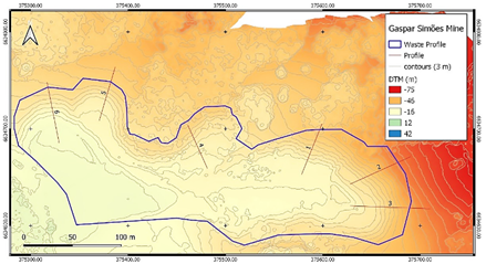 The Waste Rock Dump at Gaspar Simões Mine is in operation, and studies for environmental licensing purposes have been reviewed for 2021. Surveys were carried out and a proposal for reconfiguration to a more conservative geometry was made. Although a field test (SPT) was performed and used for parameter inference, it reached a depth of 0.80 meters in the WRD; reaching as expected the impenetrable - since the controlled WRD is composed of blocks of various sizes and compacted soil. As originally proposed, the project configuration was 45° slopes with a maximum height of 10 meters subdivided by 4-meter berms. Thus, an extensive redesign of the current WRD profiles with heights between 19 and 25 meters would be required. In such a proposal the SF would reach 3.29. In 2022 a new evaluation will be performed to verify the stability of the current situation and the new final profile proposal. As a basis for the study, the available documentation was used, and the structure was mapped with a UAV. Afterward, the images were processed in a GIS environment to verify the profiles and evaluate the geometries. Fig. 3 presents the DTM of the dump and the main profiles identified.
