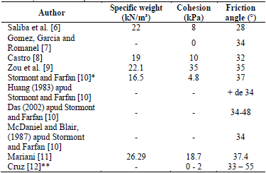 It is relevant to point out that divergence occurs regarding the value considered for cohesion, whose occurrence is related to the characteristics of the matrix where the larger fragments are embedded, and/or the scale of the structures. Table 1 presents a survey of resistance parameters considered in literature by the Mohr-Coulomb criterion.