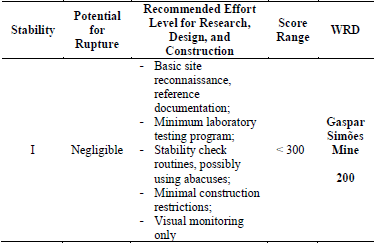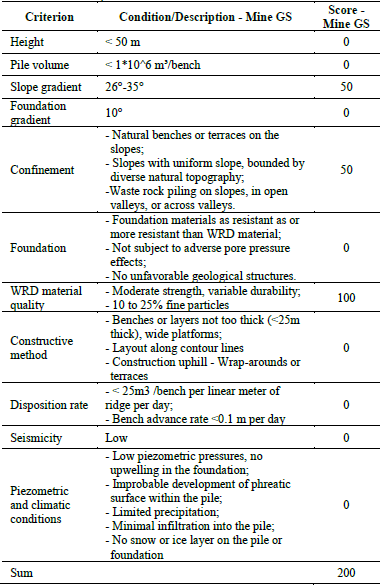 Tables 4, 5 and 6 present the application of the methodology for the WRD of the Gaspar Simões Mine, considering the current situation, projected expansion, and execution of the new pile projected for the northern area.