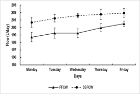 In the FFCW, the operating cost during business days was 199.5±2.1 L day-1 (mean ± standard deviation), with a minimum value of 195.8 L day -1 and a maximum of 203.8 L day -1. For the SSFCW, the operating cost was 201.1±2.1 L day-1, presenting a minimum value of 197.3 L day -1 and a maximum of 204.5 L day -1, so the HRT for the FFCW (0.1 m of support) was 6.7 days and for the SSFCW (0.5 m of support) it was 3.5 days. For the weekend (Saturdays and Sundays) spending tends to zero. Next, Fig. 2 shows the behavior of spending during the week for both types of CW.