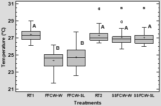 The results of the statistical analysis of the experiment show us that in temperature a significant statistical difference was found between the medians (p<0.05). FFCW-W treatment presented the lowest median value with 24.65 °C, followed by FFCW-SL with 24.7 °C, while the highest value was RT2 with 27.0 °C (Fig. 3).