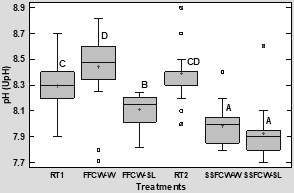 In pH (p<0.05), the SSFCW-SL treatment presented the lowest median value with 7.9, followed by SSFCW-W with 8, while the highest value is the FFCW-W treatment with a pH of 8.48 (Fig. 4).