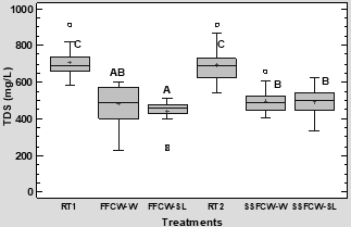 In the TDS (p<0.05), the FFCW-SL treatment presented the lowest median value with 460.0 mg L -1, followed by the SSFCW-W with a median value of 486.5 mg L -1, while the highest value is RT1 with 690.5 mg L -1 (Fig. 5).