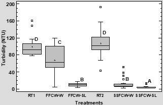 Turbidity and color also showed a statistical difference (p<0.05). The SSFCW-SL treatment presented the lowest median value of turbidity with 3.15 NTU, followed by SSFCW-W with 7.35 NTU, while the highest value is the RT2 treatment with 102.0 NTU (Fig. 6).