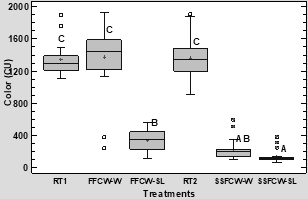 The CWFS-SL treatment presented the lowest median value of color with 116.0 UC, followed by CWFS-B with 196.0 UC, while the highest value is the RT2 treatment with 1345.5 UC (Fig. 7).