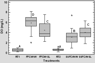 The OD (p<0.05), revealed that the FFCW-W treatment presented the highest median value with 6.55 mg L -1, followed by the SSFCW-SL with 4.2 mg L -1, while the lowest value is RT2 and RT1 with 0.6 mg L -1 (Fig. 8).