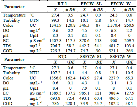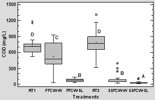 Finally, for the COD parameter (p<0.05) it was found that the lowest median value was in the SSFCW-SL treatment with 24.5 mg L -1 , followed by the FFCW-SL treatment with 72.5 mg L -1 , with the SSFCW treatment -W with 82.0 mg L -1 . The treatment with the highest value was RT2 with 769 mg L -1 (Fig. 9).