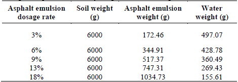 Table 4: Dosage of asphalt emulsion by weight for CBR testing of soils.