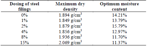 Table 7: Modified Proctor test results for soil with the addition of steel filings.