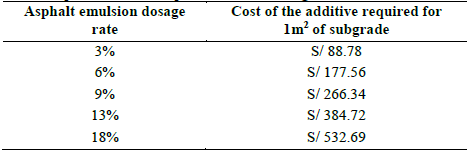 Table 9: Cost of asphalt emulsion required for 1m2 of subgrade.