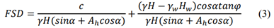 Where H is the depth of the failure surface [m], 𝐻 𝑤 depth of the water table measured from the top of the slope [m], c is the soil cohesion [kPa], φ is the internal friction angle of the soil [º], γ is the unit weight of the soil [kN/m3], 𝛾 𝑤 is the unit weight of water [kN/m3], α is the slope of the terrain [º] and A h is the characteristic acceleration of the study area.