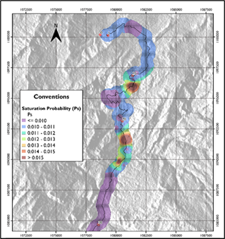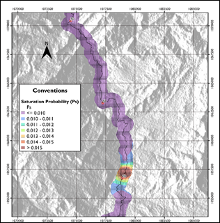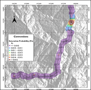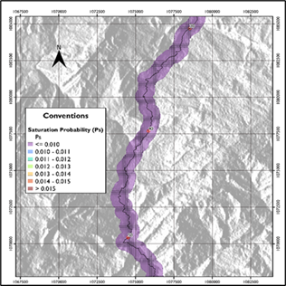 Figure 3-b: Distribution of the probability of soil saturation in the Tunja-Guateque road corridor from PR30+000 to PR55+000.