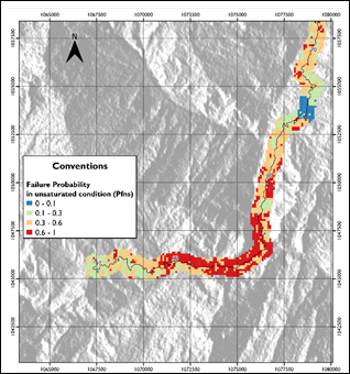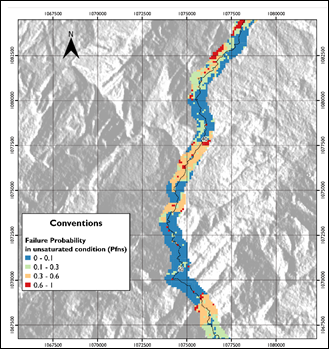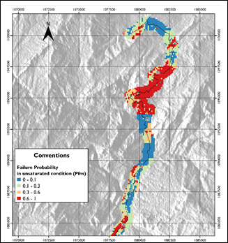 In Fig. 4-a, 4-b, 4-c, and 4d, the failure probability distribution in unsaturated condition P fns was represented and was determined that in areas where it is higher coincided with the data from Fig. 1 from PR10+000 to PR20+000 and PR55+000 to PR65+000. This Geological Unit belongs to an area resulting from the weathering of the rocks of the Arenitas de las Juntas Formation and is characterized by having geomechanical properties of a soil with a low cohesion level that is likely that due to the fact that there is a greater probability of failure in the unsaturated condition from the areas represented in red.