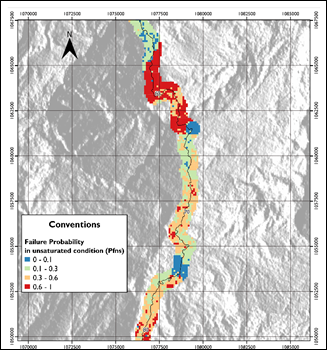 Figure 4-b: Failure probability distribution in unsaturated condition 𝑃 𝑓𝑛𝑠 Tunja-Guateque road corridor from PR30+000 to PR55+000.