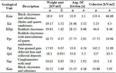 The geology and geomorphology of the corridor from the city of Tunja to the municipality of Tibaná, is located on the Machetá fault, the Guayabal fault in the municipality of Chinavita, and the Puente Tabla fault in the municipalities of Garagoa and Guateque. The predominant materials in the area correspond to colluvial deposits, mass composed of clay matrix blocks. From the geological map of Colombia [14], the geological units present in the Tunja-Guateque road corridor were determined, as shown in Fig. 1. For each type of soil present, the resistance and unit weight parameters shown in Table 2 were assigned. For each soil, the denomination used in the geological map and the corresponding mean (μ) and standard deviation (σ) values are presented for each parameter.