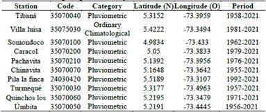 The daily precipitation data obtained from the ordinary fluviometric and climatological stations of IDEAM close to each of the registered landslides were downloaded.