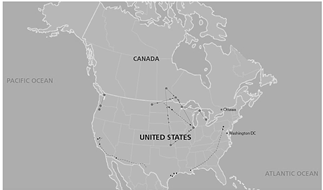 Figure 2: Simplified map of hazardous liquids pipelines spills from 2010 to present. TransCanada (-), Kinder Morgan (--) and Enbridge (bold).