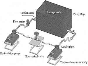 If the rotational speed of the impeller is further increased, the flow no longer goes from the high to the low energy level but starts to pump. This is the pump-reverse mode of operation. Said mode of operation can be obtained in a pump mode by placing the system to work in a rotation opposite to that for which it was designed; this mode of operation can be easily found if you have a bad electrical connection in such a way that the sense engine rotation is opposite. All the modes of operation can be found in Fig. 2.
