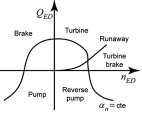 For the characterization of turbomachines, the international technical standard IEC 60193 is used [23], in which the construction of the four-quadrant characteristic curve is proposed. This curve is constructed using two dimensionless terms, one referring to the flow rate and the other to the rotational speed of the machine, Q ED , and n ED [23]. This characteristic curve shows five typical turbomachine operation forms: pump mode, pump-brake, turbine mode, turbine-brake mode, and pump reverse mode [24-26], explained below.