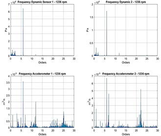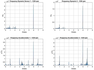 Due to the different dynamic sensors with which the experimental installation was carried out, it is possible to have the signal for two active sensors and two accelerometers located tangentially next to each other. This allows us to observe how non-invasive sensors can see the same behavior as invasive sensors. In addition, non-invasive sensors or accelerometers will enable us to see other structural and dynamic components that are important in characterizing the pump as a turbine. An example is seen in Fig. 5 since the 3X element appears in the accelerometers, a symptom of misalignment [31], which cannot be seen by invasive or dynamic sensors that can only provide information on the hydraulic component.